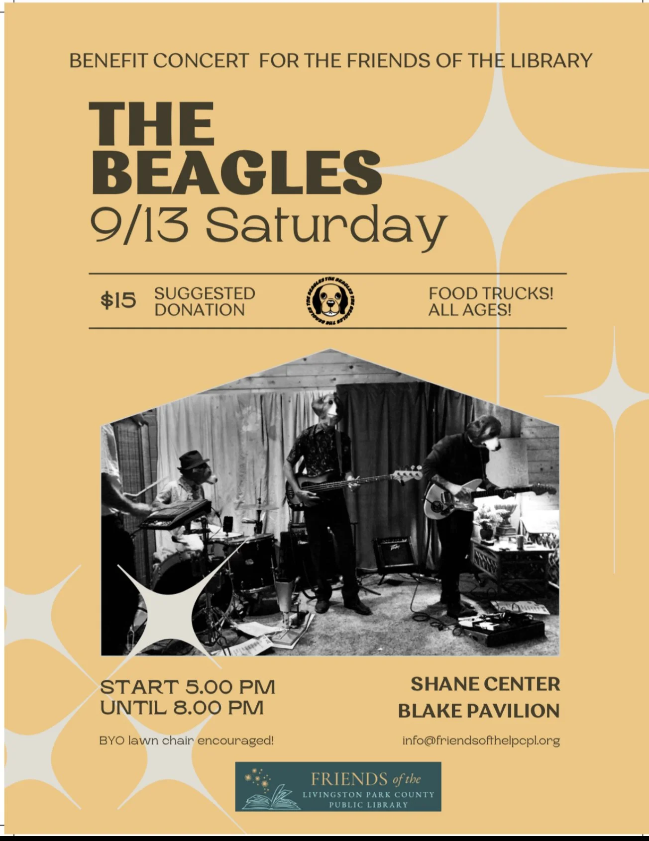 Enjoy live music from The Beagles πΎ, delicious food trucks, and fun for all ages β all while supporting the Friends of the Livingston Park County Public Library!